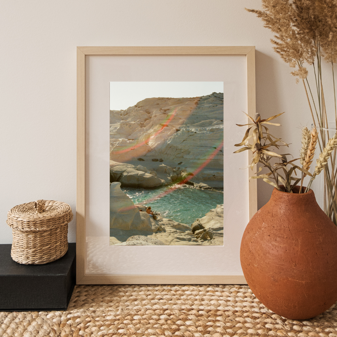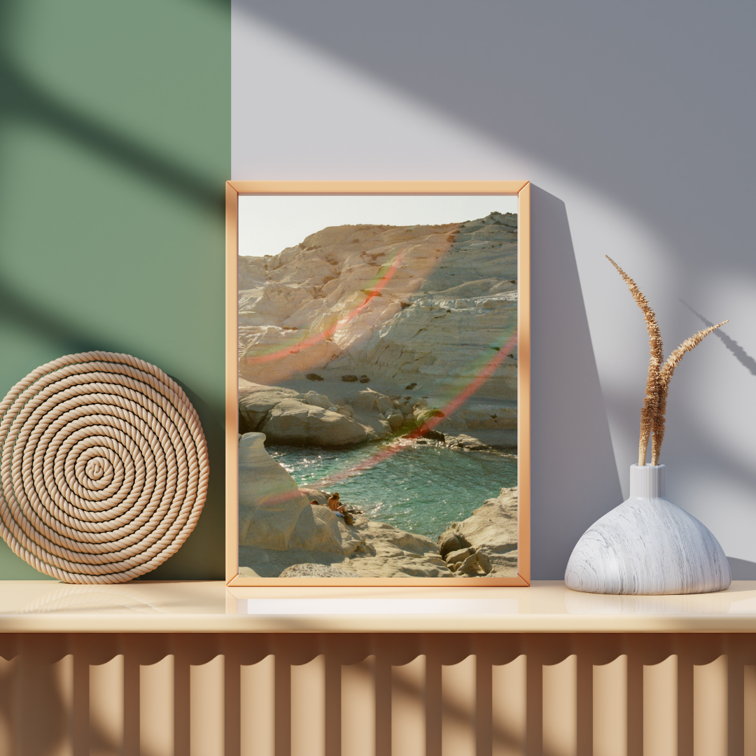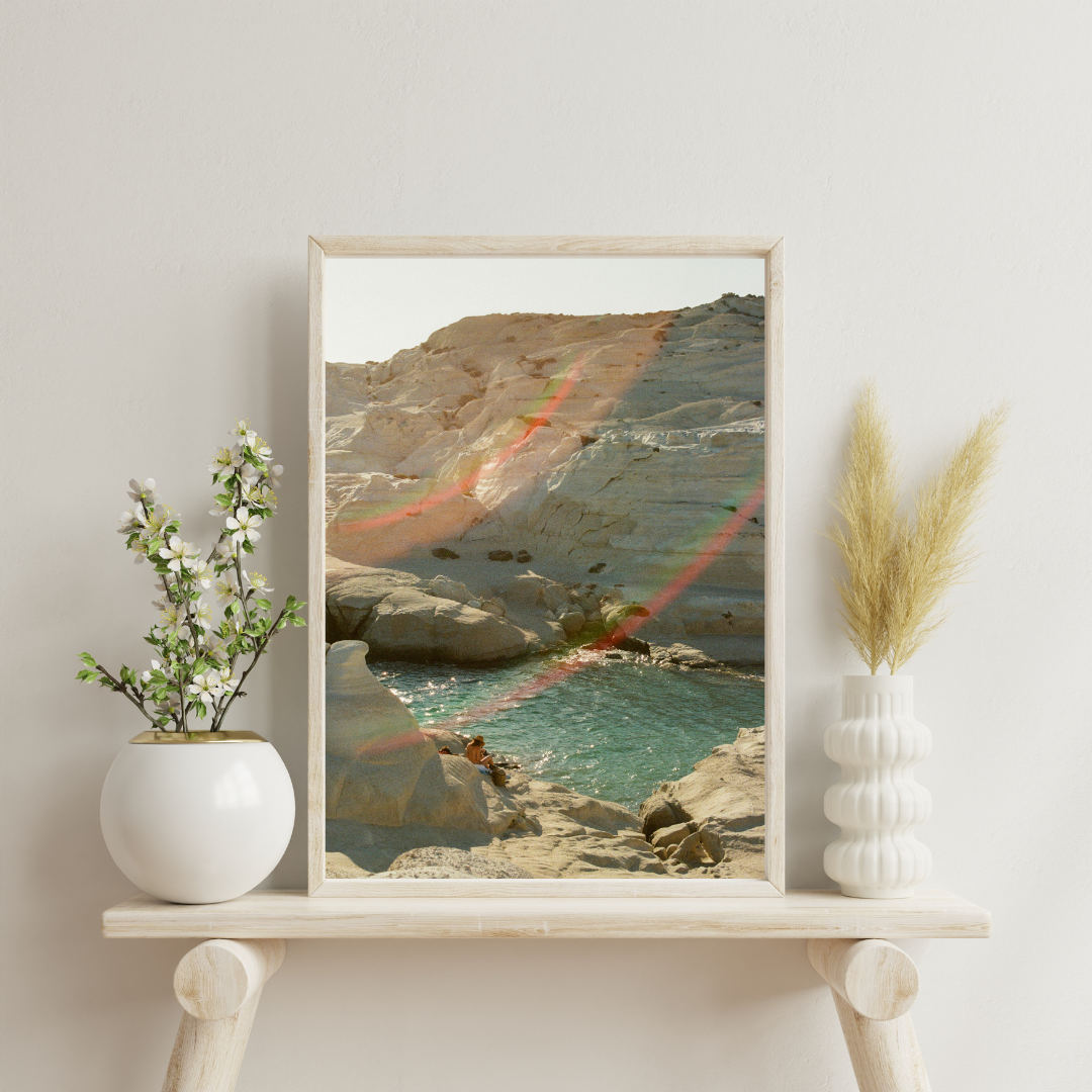 Bring the sun-drenched beauty of Milos into your home with this fine art print. Featuring glowing white rock formations, crystal-clear turquoise water, and a soft rainbow lens flare, this image captures the effortless calm of a Greek island summer. Printed on high-quality 200 gsm premium matte paper, it delivers vibrant colours, crisp detail, and a professional gallery finish.